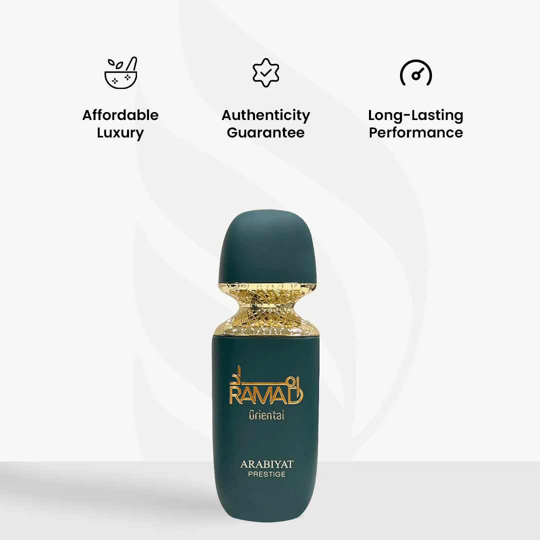 Ramad Oriental by Arabiyat Prestige is an evocative journey into the heart of mystery — a daring oriental-woody scent that balances brightness, spice, and smoky resins with impeccable precision. The opening is brisk and arresting, with a citrus medley of lemon and bergamot laced in the sharp warmth of cardamom, elemi, and pepper — a bright spark that draws you in.