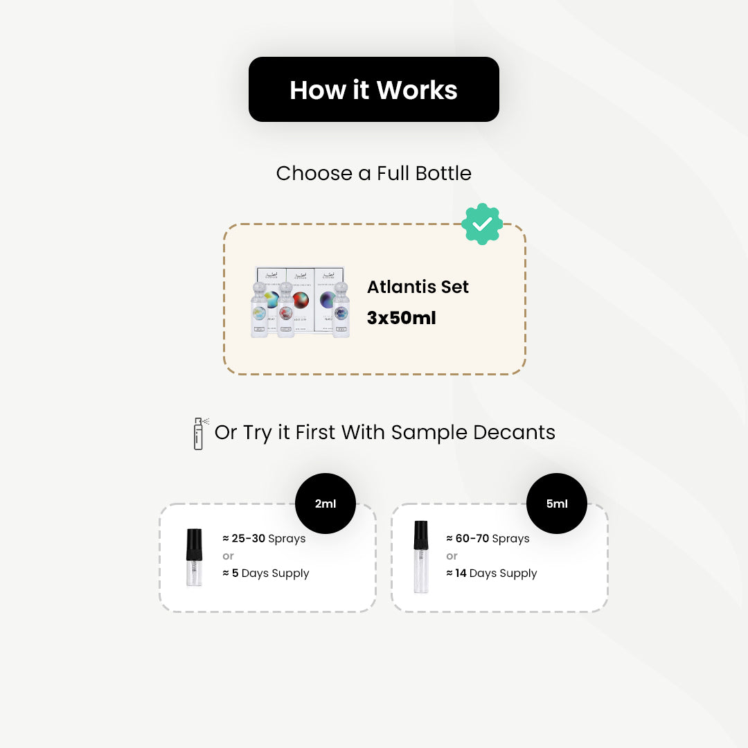 Atlas part of the Atlantis Set by Gissah is a captivating Floriental Leathery fragrance that embodies the mythical allure of the Atlantis Collection. It opens with a refreshing and aromatic burst of Lavender, paired seamlessly with the zesty citrus of Bergamot and the crisp sweetness of Apple, setting a lively and inviting stage. As the fragrance unfolds, it reveals a lush heart of Rose and Jasmine, where the opulence of florals deepens the initial freshness, creating a rich, intoxicating middle that seduces the senses. The journey concludes with a profound base of Amber and Leather, which imparts a luxurious, warm finish that is both earthy and refined. This combination of floral elegance with the rugged, smoky nuances of leather defines "Atlas" as a scent of contrasts—both ethereal and grounded, mysterious and familiar.