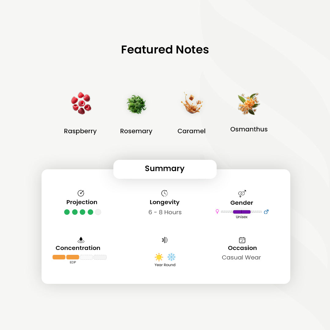 The heart of the fragrance deepens into warm sensuality. Caramel drips decadently over floral notes of osmanthus and jasmine, offering a rich yet airy harmony that feels both playful and poised. As the scent evolves, it reveals a grounding base of patchouli and cedarwood, wrapped in the supple depth of leather, creating a finish that is smooth, smoky, and unforgettable.
